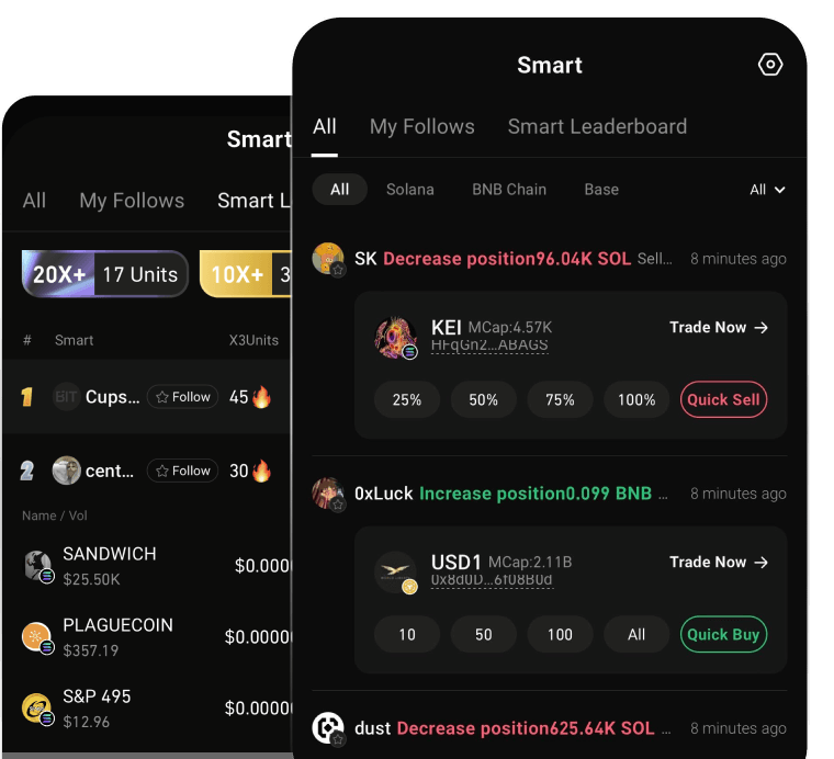 GoRich Smart Money Signals provides the most comprehensive list of KOLs (Key Opinion Leaders) across the crypto space. It monitors their buy and sell activities in real-time, delivering precise trading signals to help you seize market opportunities. With one-click order placement, you can effortlessly follow KOLs’ investment moves and execute strategies quickly. Core Advantages:Comprehensive KOL List: Includes top global KOLs, such as NFT players and crypto investors, ensuring broad coverage.Real-Time Monitoring: Tracks KOL trading behavior 24/7 to capture every opportunity.Instant Signals: Delivers immediate buy/sell notifications for faster decision-making.One-Click Trading: Simplifies the process, allowing seamless execution of KOL-inspired trades to boost investment efficiency.