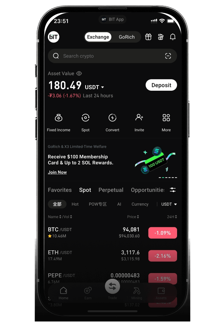 On the GoRich homepage or the [Assets] page, select [Deposit] or [Transfer].Deposit: Directly fund your GoRich account with supported assets (BNB, ETH, SOL, USD, USDT).Transfer: Move funds from your Bit.com funding account to your GoRich account. Fund Transfer Guide